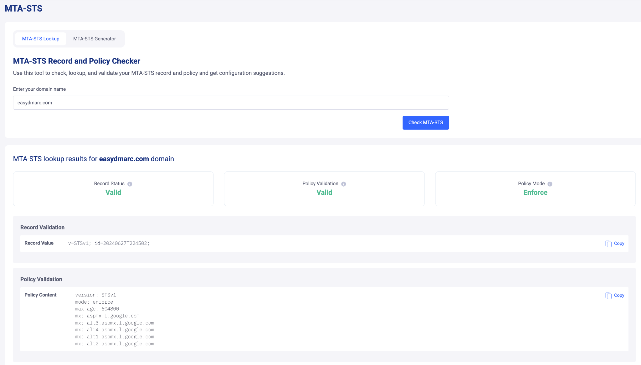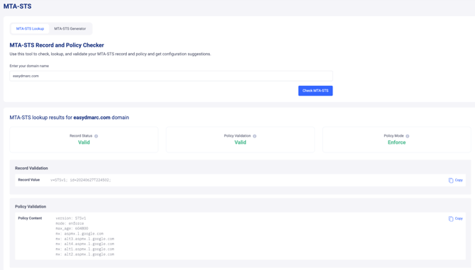 3- Reporting: The checker could provide a summary or detailed report on the status of the MTA-STS records and policies, indicating whether they are correctly configured or if any issues are detected.