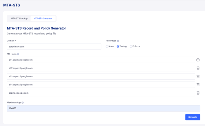 5- Guidance: The generator could offer guidance on how to implement and publish the generated MTA-STS records and policy files to ensure they are correctly configured and take effect.