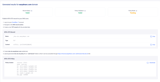 4- Download or Publish: Users can download the generated MTA-STS record and policy file for manual DNS entry and web server hosting, respectively.