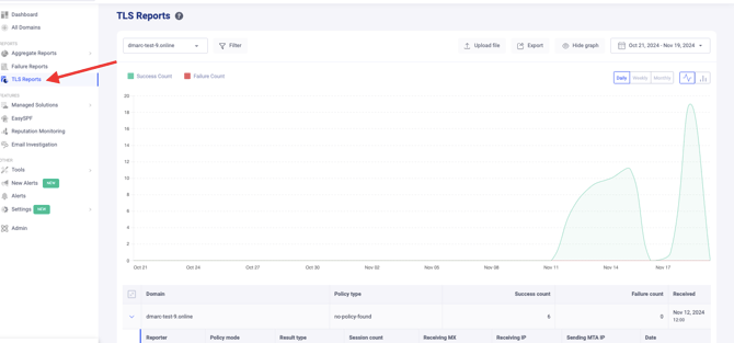 7. Once everything is properly configured, you can monitor your TLS reports in the TLS Reports section, where you’ll have access to the dashboard and detailed reports.