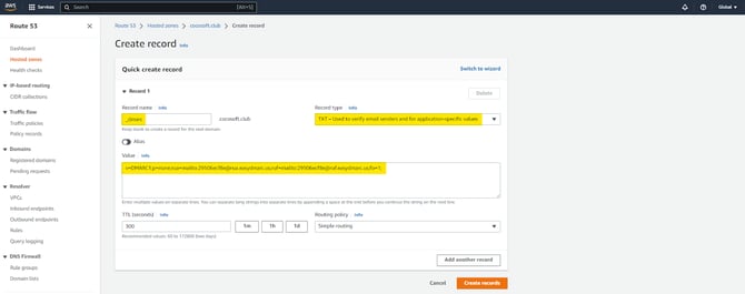 After updating, click “Create records” to finish your Amazon Route 53 DMARC setup.