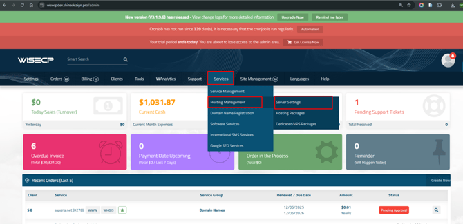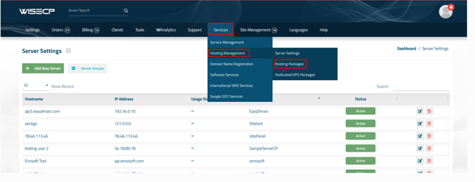 - Sign in to your WiseCP Admin panel and go to Services → Hosting Management → Server Settings